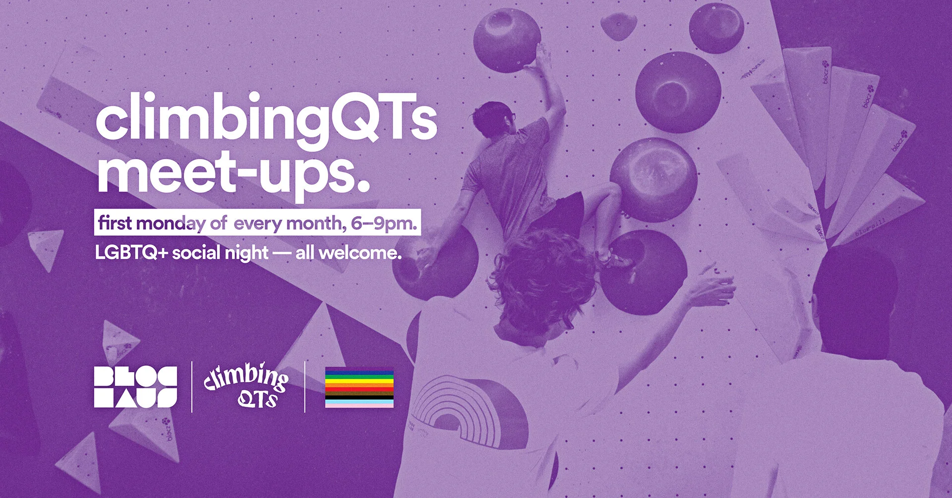 ClimbingQTs is an LGBTQ+ social club that welcomes climbers of all backgrounds & abilities. We’re proud to collaborate with them to create space for LGBTQ+ folk to come together to learn new skills, participate & find a sense of belonging in Haus. For more info & uplifting meme culture follow ClimbingQTs on insta @ClimbingQTs